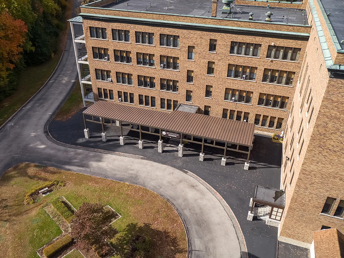 The Architects added a vestibule at the Presentation of Mary Academy’s main entrance and roofed the ADA access. A canopy was designed to accommodate 12 student groups for parent pickup, announcing the main entrance. The steel-framed canopy supports an arched wood roof deck with standing seam metal roofing. Site drainage was improved as part of the project, creating a welcoming and functional front entry for the school.